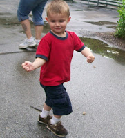 It was a fun drive to the zoo. Grandma and Grandpa drove with us. I sat in the back seat with Kenzie and Jacob. Kenzie loved taking pictures of the tall buildings throught the wet window. When we got to the zoo it was raining pretty hard. We got out the umbrellas and headed to the butterfly building. I had never seen butterflies coming out of their cocoons before. It was really neat. We then took a walk over to the Oceans building. All the kids really loved this. We enjoyed looking at the fish and the seahorses. Then we walked over to see the penguins. Jacob touched a penguin egg. My favorite was when we got to pet the sharks. That was very cool. Jacob liked looking at them but didn't want to touch them. Adam got to splash in the water but one didn't come up close enough to the surface for him to touch. We walked through the Deserts building and saw the turtles, lizards and meerkats. Adam liked walking around in there. A lady told him hi and he got shy and quickly headed towards me and fell over. Many times, when someone new tells him hi, he'll hide his head in my legs with a grin. We took a walk to look at many different snakes. Jacob wanted Daddy to read him what kind of snake they were and then he would walk to the next one. We waited around shortly for the dolphin show which started at 12:30. While we waited they kids played on the playground. Now it was lightly sprinkling out. None of them went down the slides:) It rained harder as we walked over to the dolphin building. When we sat in the bleachers Adam got fussy on my lap because he wanted down. Once the show started he enjoyed it but got fussy towards the end. I walked with him down closer to the tank and stood there until the show was finished. Jacob complained that he was hungry. The rain stopped and it was nice outside. We headed to the van where we ate our lunch. Saw the seals and sea lions. Walked over and saw the Koala's. One was eating in the tree and the other one was sleeping. The giraffes were eating from the trees and we saw a couple young ones. We had to walk across a movable bridge which Jacob didn't really like to see the Rhino's. All three Rhino's were sleeping in the mud. Jacob said, "no me wanna leep in mud, I get all dirty". Adam really enjoyed seeing all the animals. I was amazed at how he noticed them all and was very interested in watching them. Jacob liked walking around pretending he was holding a steering wheel and driving. We got to learn some things about elephants and pet them. Kenzie and Adam liked petting the elephant but Jacob only wanted to look. The kids, Jared, Grandma, and I took a train ride. We sat in the back of the train and were the only group on the ride. Jacob and Kenzie sat in the very back. Adam sat with Mommy and Daddy and Grandma rode in front of us. Jacob really loved the ride. Adam also loved it but wanted to be held tight. He had a little bounce to the music. Shortly after the train ride Adam fell asleep. We walked throught the gift shop. Kenzie got a sucker. Kenzie really wanted to go back and see the butterflies and go throught the gift shop in that building. We went over their and she bought herself a couple things. She also bought Jacob a sucker. We walked in the room with the butterflies and then went outside and walked throught the beautiful garden. Adam woke up as I took him down the steps into the garden. It was a great day at the zoo. We left shortly after 4pm. We stopped at Eric and Kat's house to see their fish aquarium. They came back to Jared's parents house and we all had dinner together outside. Then we had some yummy pie and ice cream. We took Kenzie to Build-a-Bear. Eric, Kat, and Andrew also came along. Kenzie had a hard time deciding on an animal. She picked out a bunny and named it Sarah. Then she picked out an outfit and some sunglasses for her bunny. We walked through some of the mall. The boys and Kenzie played on the rides. Jacob was driving a bus and another boy came in with him. The boys Mom went to put the quarters in and Jacob jumped out quickly and got in another vehicle. Jacob and Adam were very tired and Kenzie was begging to leave so she could dress her bunny in the car. We decided to walk through Childrens Place and then leave. Jacob picked up a cute little girls skirt, showed it to Daddy, and said, "dats cute". After we left we decided to make a quick trip into BabiesRUs. Got home around 9:30 and all three kids were asleep. They barely woke as I dressed them in their pj's and we tucked them in bed.