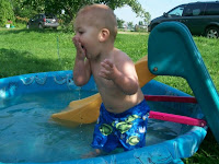 Jared drove out the driveway this morning and the dogs started barking a lot. I got up to look out the window and see why. Our tent had blown into our neighbors yard and Jared was bringing it back. Jacob came down to the bedroom this morning around 8:30. He spread his blanket out on our bed and played with his cars for a little bit. Adam woke up around 9am. After breakfast the boys sat on the floor next to each other, looking at books. Adam loves to pick out a book and bring it over to me. He’ll hand it to me and then hold him arms out for me to pick him up. After were done reading the book, he’ll get down, walk a little ways, and then come right back for me to read again (though he may trade books first). When Jacob sees us reading he always comes over to climb up on my lap (or the arm of the chair) too. Jacob wore his vest this morning to play “struction worker”. He rode around on his green tractor with his John Deere keys in hand. When he was done “working” he had me untie his vest so he could take it off. He played at the counter with his blocks, tractors, tow truck, and semi truck. He is very creative with his blocks. Adam still hasn’t figured out that he can get on the couch by himself, even though he can climb up the back of the couch. He pulled the dump truck over to give him a step up. He then climbed up the back of the couch where he found Jacob’s tractors. I worked on a Camping list. The boys liked playing with the scrap pieces of paper. Adam sat on my lap to draw on his paper with my pen. While Adam was napping Jacob and I went outside. It was really hot out there. Jacob didn’t like being in the sun so he found some shade to play in. I got us some shovels and we played in a couple large molehills. I walked in the yard to look for the stakes for our tent. I’ve found three of the five missing stakes. Then I got out the kids pool and cleaned it up. Since Jacob doesn’t really like the sun I put it mostly in the shade. Then we went inside to get the slide. He played that pool even when there was only an inch of water. We wet the slide down so he would slide faster. He loved it and had so much fun. He’d lie down and pretend to take a nap, but wanted me to read to him first. Then he wanted me to hand him “one book” (he always sleeps with one) to have in bed. He ran around the garden and wanted me to spray him with the hose. I had the hose spraying on jet and Jacob would say, “dat feels bumpy”. He’d say, “spray my face, spray my belly, spray my butt”. As he continued to play I weeded the garden. He loved helping me water the plants with his sprinkling can. He got quite so I looked up to find him carrying Tiger (barn cat) and trying to put him in the pool. When I told him not to put the cat in the pool he said, “look, dat is a kiddy pool”. Jared called to say he’d be home from work late. Adam woke up around 5:30 and I got his trunks on. Jacob was really excited to play with him in the pool. Adam didn’t like it at first but soon was having just as much fun as Jacob. Jacob had Adam laughing when he’d wet his hands and pat Adam’s belly and back. Adam reached down to wet his own hands and then would pat his belly. He also liked sticking his face in the water. Jacob kept spraying his face with the hose and wanted me to take a picture of it. Then he’d run over to look at the picture and laugh at it. We went inside for dinner at 6:30. Soon after that Daddy came home. After dinner we went outside to take down the tent. Jacob and Adam carried apples to the chickens and horses. Adam hung onto his two large apple for awhile before giving them away. The horses wouldn’t come out from their lean too. Jacob climbed the gate and called their names really loudly. We headed into town to get a few groceries. We walked through the camping things and the toys also. When we got home we had a little playtime before their bath. After getting Adam out of the tub I lay him down to put on his diaper. He grabbed the baby bath soap. I thought the top was on but he had opened it and the soap was pouring into his mouth. Poor guy – yuck!