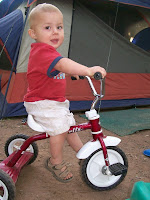 Adam woke up around 6:30. Jacob came to lay on our bed also. We got up and walked around camp and then walked over to pebble beach. We stayed to play in the sand. Jacob stuck a bunch of sticks in the sand saying they were his trees. Daddy and Jacob made smooth roads with sticks and bumpy roads by rolling a pine come over the sand. Then they’d drive their cars (rocks) over the road. We then took a walk over to the playground. Got back around 11:00. We took a trip to visit a store called the Laughing Loons. Both boys fell asleep on the drive back to camp. They woke up when we opened the doors. After lunch I lay Adam down for his nap. Grandma brought her chair over to our site and read a book. Jared, Jacob and I took a walk over to the East campground. We needed to get Jacob’s blanket washed. On the way we took a hike through the woods. Jacob and Daddy would run ahead and hide on me. Then they’d jump out to scare me. We walked through some of the fort buildings and the fort store. Jacob got an orange sherbert push up. While we waited for the clothes to get done we took a walk to the East campgrounds beach. Jacob wanted to take off his clothes so he could get wet. He liked throwing the rocks in the water and also enjoyed seeing the minnows. We stopped at the playground on the walk back to camp. Got back ~2:30 and Adam had just woke up. We took a walk and Jacob fell asleep in the stroller. Back at camp Jacob continued sleep and slept for a couple hours. We cut up veggies for aluminum foil dinners. Adam loved his meal but Jacob only ate his applesauce. After dinner we took a walk to the camp playground. Adam was so excited he clapped his hands as I put on his shoes. During our walk Jacob would sit on the ground and wait for us to get ahead of him. Then he’d run towards us and Daddy would turn around, pick him up, and tickle him. Jacob would laughed and say, “I can’t handle this”. Around 8pm we went with Grandma and Grandpa to the Berry Patch (ice cream store). By the time we got back it was time for the boys to get cleaned up for bed. Adam enjoys his bath in the sink and Jacob loves taking a shower. When we got back Adam was ready for bed. Jacob sat with us by the fire until bedtime.